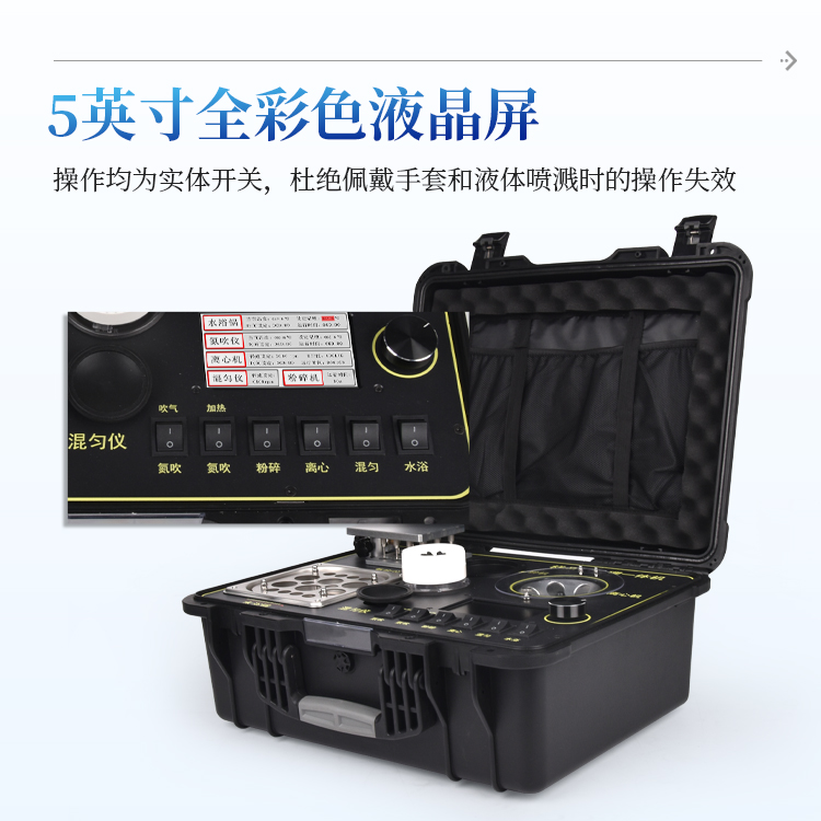 简要描述: 食品安全检测样品前处理一体机IN-QC5功能紧凑,集成五种样品前处理常用的功能,完成样品一站式处理。结构稳固,机箱采用高品质工程塑料,具备优秀的抗冲击性、耐腐蚀性、便携性。操作稳定,机器采用五寸全彩色液晶屏,功能指示性强,用户操作均为实体开关,杜绝佩戴手套和液体喷溅时的操作失效。